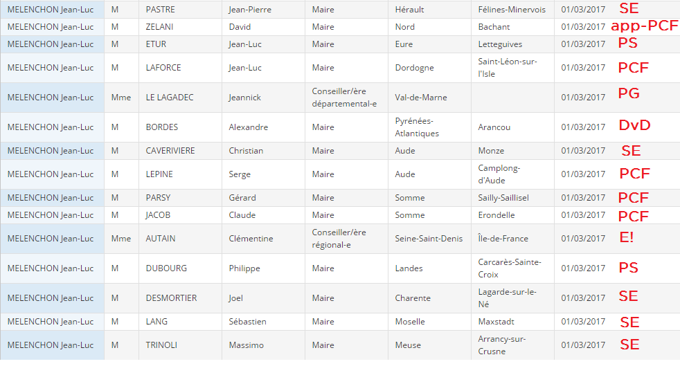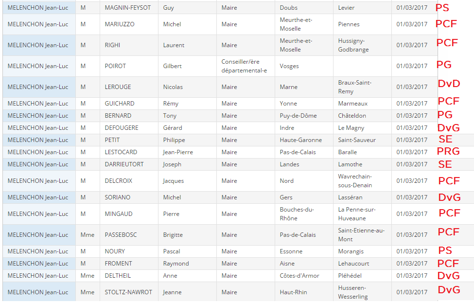 1717 signatures ont été publiées par le Conseil constitutionnel aujourd'hui. Parmi ces dernières, 87 ce sont portées sur Jean-Luc Mélenchon, dont 25 issues de maires PCF, 4 app-PCF, 10 PG, 6 PS, etc.