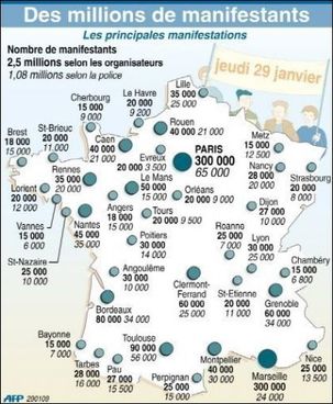 La participation aux 200 défilés a atteint 2,5 millions de personnes, une mobilisation comparable aux pics de participation aux défilés contre le CPE (2006), la réforme des retraites (2003) et même le "plan Juppé" (1995)