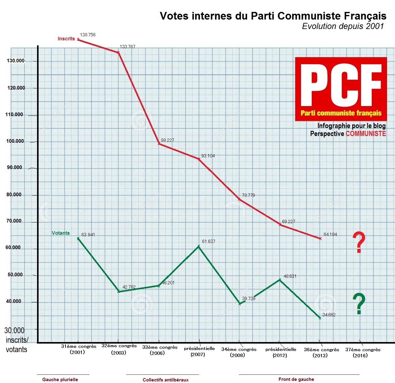 Pour le 36ème Congrès du PCF, il y avait 64.184 inscrits (cotisants) et 34.170 votants. (Voir l'évolution des scrutins internes) - Le texte alternatif 1, "Unir les communistes pour un PCF de combat, marxiste, populaire et rassembleur" avait obtenu 11,08% des voix. - Le texte alternatif 2, proposé par La Riposte avec "Combattre l'austérité, en finir avec le capitalisme" avait obtenu 9,95% des voix. - Le texte alternatif 3, proposé par la tendance "Vive le PCF" avec "Un parti résolument communiste dans l'affrontement de classe ni abandon ni effacement" n'obtenait que 5,82% des voix. Et dans le cadre de la préparation du 37ème congrès du PCF les bouches s'ouvrent. Les contributions sont nombreuses, très riches, et on peut les lires en ligne (http://congres.pcf.fr/. A l'issue des travaux du Conseil national, un projet de base commune a été adopté par le Conseil national des 5 et 6 mars 2016. Projet de base commune : "Le temps du commun" - Texte complet)