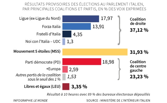 ItalieIl y a deux grands gagnants des élections législatives italiennes : Le M5S et l'extrême droite de la Ligue (ex-du Nord). Toutes les formations "classiques" issue des grandes mutations d'après 1991 (Parti démocrate, Forza Italia ...) s'effondrent et la gauche (liquidée, refondée et illisible) disparaît