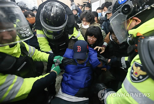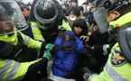 Cette loi promulguée en 1948 pour lutter contre le communisme, interdit toute activité «anti-État» , toutes activités communiste, et toute propagande des idéaux politiques du Juché nord-coréens. "(La hausse) est attribué à une répression intensive suite à des violations du droit de la sécurité, notamment avec l'arrestation d'un homme d'affaires qui aurait remis des informations classifiées à la Corée du Nord et des membres d'un groupe d'activistes pro-Pyongyang" a déclaré un officier du NPA. En décembre 2013, un homme de 55 ans a en effet été placé en détention pour être accusé d’avoir transféré des technologies de pointe de l’armée sud-coréenne à l’agence d’espionnage de Pyongyang. La NPA a également interpellé six membres du parti de l’Alliance pan-nationale pour la réunification de la patrie (Pomminnyon). Ceux-ci sont soupçonnés d’avoir mené des activités en soutien au régime du Juché nord-coréen. Les syndicalistes victimes de la répression d'Etat Début décembre 2013, la compagnie d'État Korea Railroad Corporation (Korail) a annoncé la création d'une filiale pour gérer une nouvelle ligne de TGV. Le syndicat coréen des ouvriers du rail (KRWU) a déclenché la grève le 9 décembre, les grévistes de plus en plus nombreux paralysant par leurs actions une grande partie du réseau de transports national. Le 18 décembre, le gouvernement a déclaré la grève illégale et la compagnie a mis à pied 7 927 ouvriers. La police a effectué des descentes dans les locaux du syndicat à travers le pays. Puis un mandat d'arrêt pour « obstruction à l'activité économique » a été lancé contre 28 dirigeants et représentants syndicaux. Samedi 28 décembre 2013, la KTCU a appelé à une journée de grève générale en solidarité avec les cheminots : plusieurs dizaines de milliers de personnes se sont rassemblées au centre de Séoul. De son côté, Korail a entamé des procédures de licenciements et lancé un ultimatum aux grévistes, commençant à embaucher de nouveaux salariés en CDD. Le 22 décembre, à Séoul, près de 4 000 policiers ont encerclé la tour abritant la Confédération coréenne des syndicats (KTCU), dont fait partie le KRWU. Ils ont défoncé la porte vitrée du bâtiment et se sont frayé un chemin jusqu'au 17e étage, frappant et dispersant à l'aide de lacrymogènes les militants de la grève qui s'étaient massivement assis sur les marches des escaliers pour leur bloquer le passage. En tout, la confrontation a duré près de dix heures. La police a arrêté 130 personnes, mais n'a pas mis la main sur les dirigeants syndicaux qui, depuis, ont trouvé refuge dans un temple bouddhiste, où les forces de l'ordre n'ont pas osé pénétrer. Mais faire grève en Corée du Sud devient de plus en plus dangereux. Les grèves et les manifestations rencontrent une répression sévère, le Syndicat des enseignants coréens a été radié et le Syndicat des employés du gouvernement s’est vu refusé l’enregistrement de ses statuts. Les locaux des syndicats ont été perquisitionné. Onze dirigeants syndicaux sont actuellement derrière les barreaux, certains d’entre eux en attente d’un procès ou déjà condamnés et quatre autres viennent d’être libérés sous caution dans l’attente d’une audience renvoyée aux calendes grecs. |