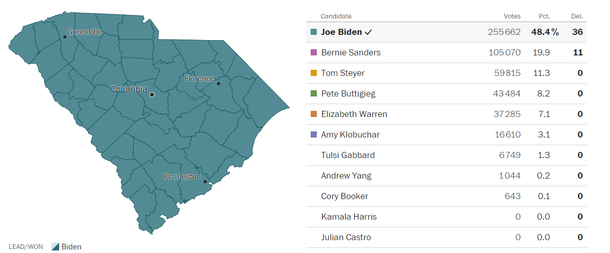 Joe Biden a largement remporté la primaire démocrate de la Caroline du Sud avec un score écrasant de 48,4% des voix et la victoire dans tous les comtés de l'état. Il a remporté 36 des 47 délégué.e.s attribué à la Caroline du Sud.