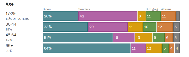 Les afro-américain.e.s représentent 56% de l'électorat démocrate et à 61% ils ont soutenu Joe Biden et 17% Bernie Sanders. L'électorat blanc, 40% des votant.e.s, a placé Joe Biden en tête (33%) et Bernie Sanders à 10 points derrière.