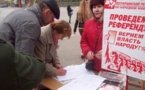 "Nous avons recueilli 3.500.000 de signatures, les citoyens ont appuyé le Parti communiste dans son exigence d'obtenir un référendum" annonce Petro Simonenko. Plus tôt, la Commission électorale centrale d'Ukraine a rejeté l'initiative populaire par deux fois et a refusé l'enregistrement du groupe d'initiative. Les communistes sont mobilisés, dans l'Oblast de Kherson, la branche régionale du KPU annonce avoir rassemblé plus de 110.000 signatures, dans les régions de l'ouest (plutôt favorable à l'UE) 150.000 signatures, dans l'oblast d'Odessa 220.000 signatures, plus de 70.000 signatures à Sébastopol, 199 088 signatures en Crimée. Les plus grand nombre de signatures recueillies ont été fait dans les oblasts de Dnipropetrovsk (402.000 signatures), Donetsk, Zaporozhye (260.000 signatures) et Lugansk. Les communistes ukrainiens proposent une alternative avec l'adhésion de l'Ukraine à l'Union douanière Russie-Belarus-Kazakhstan |